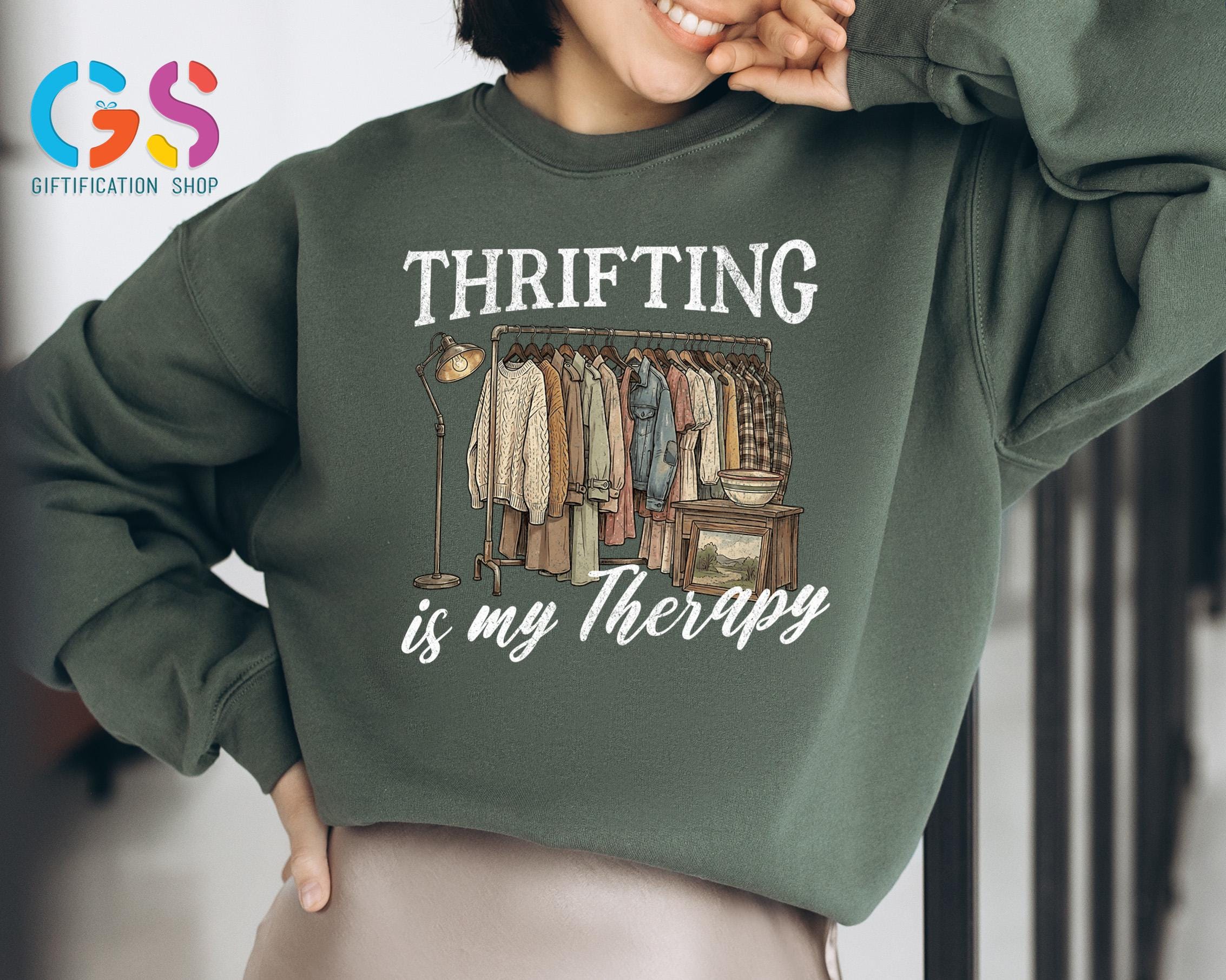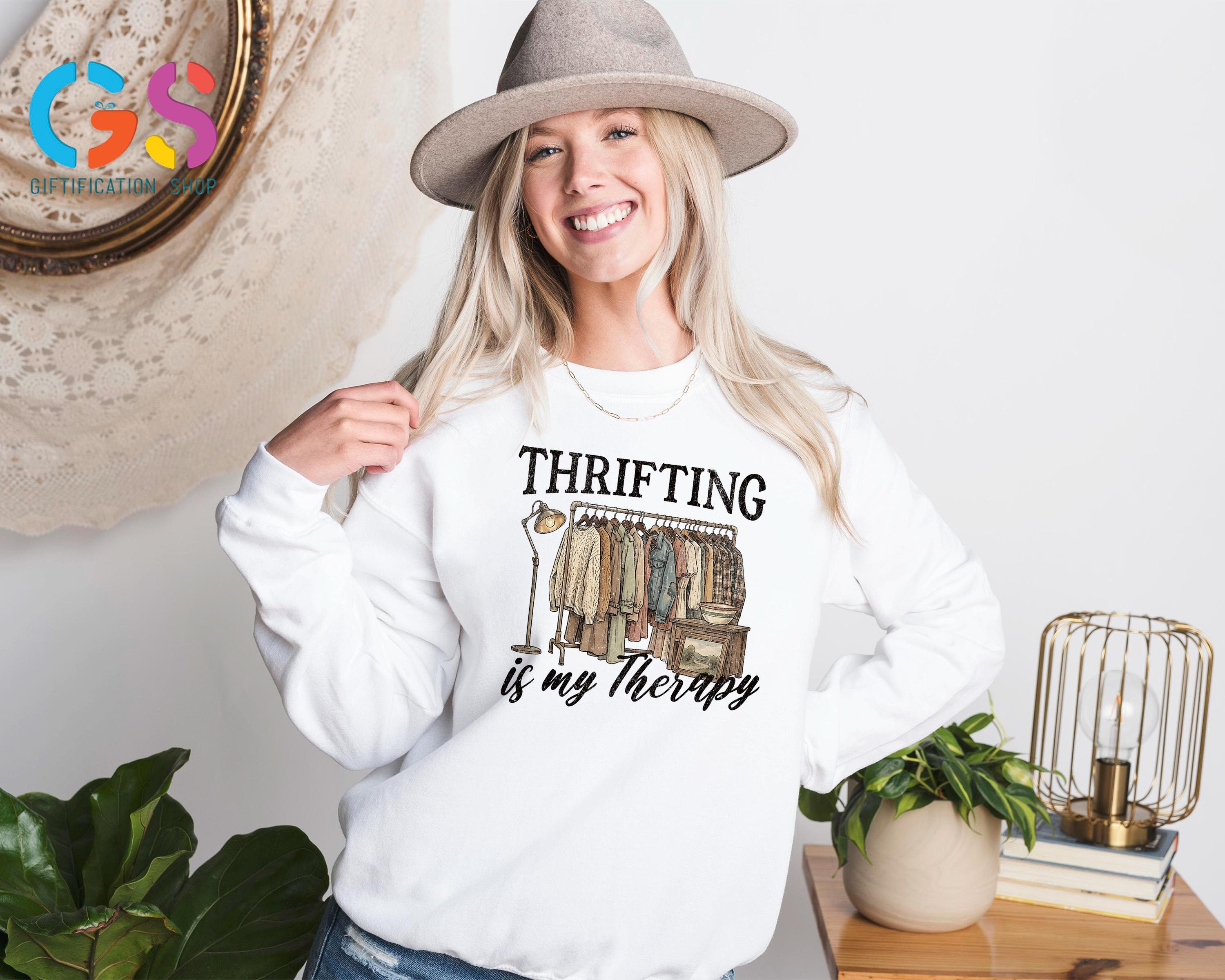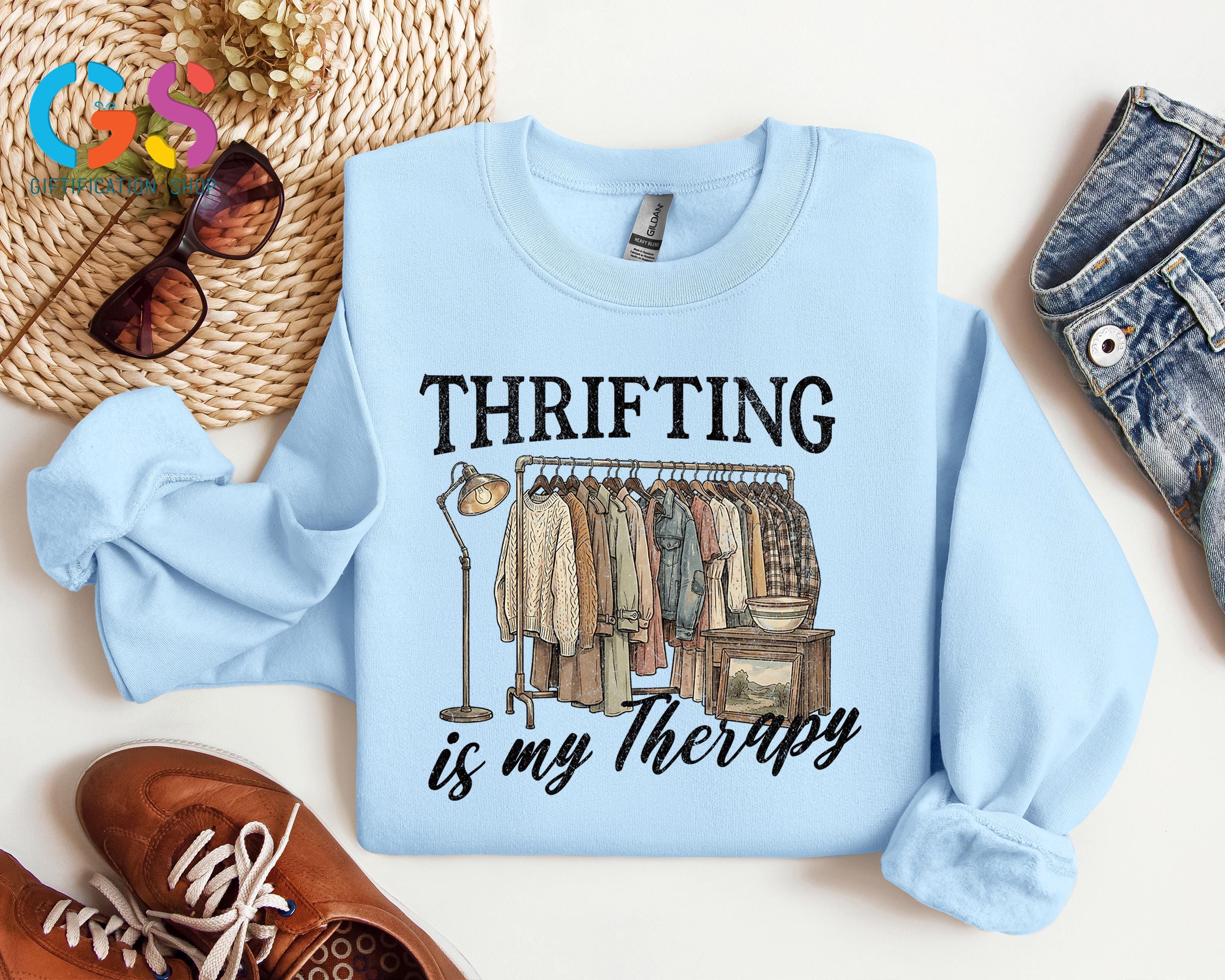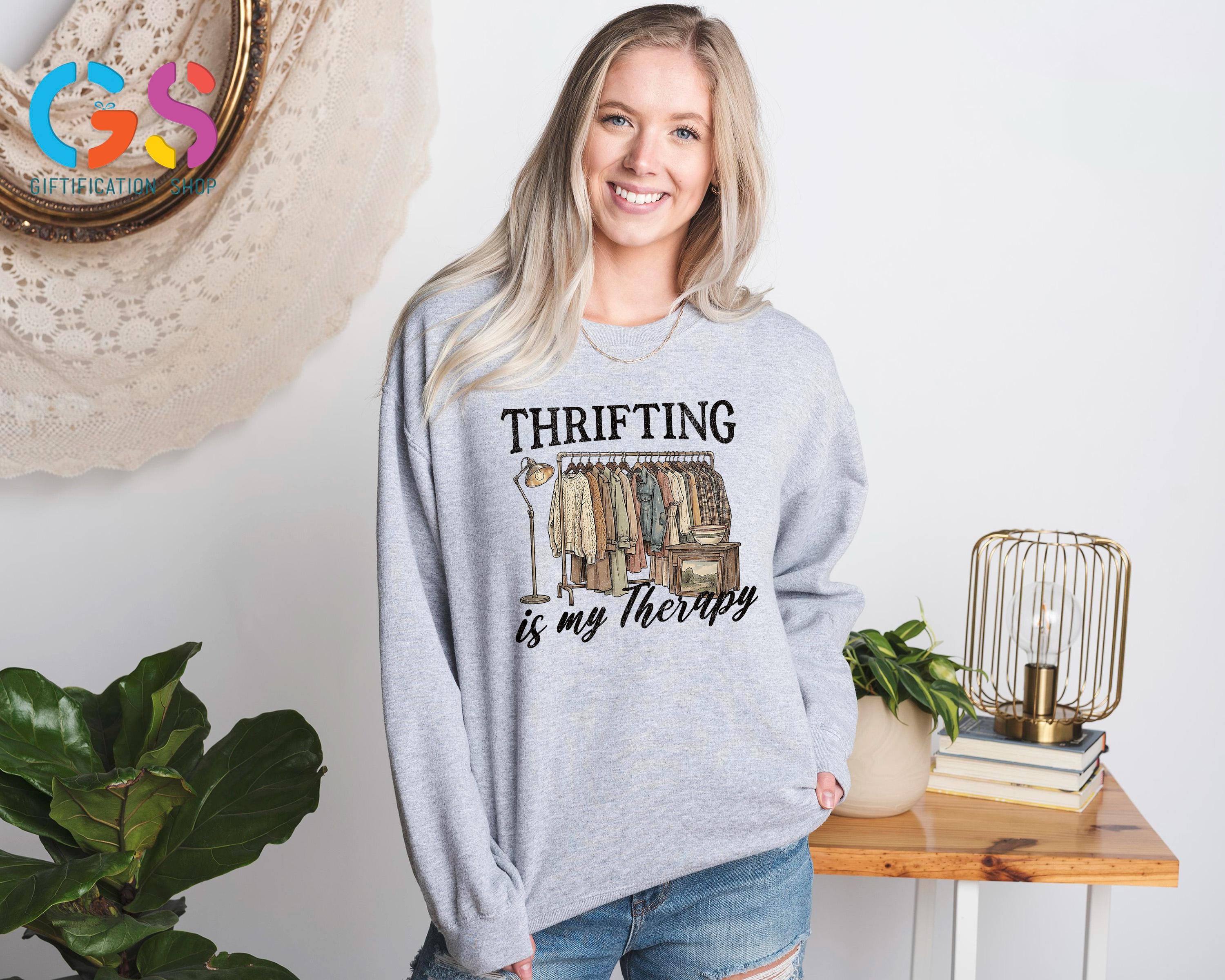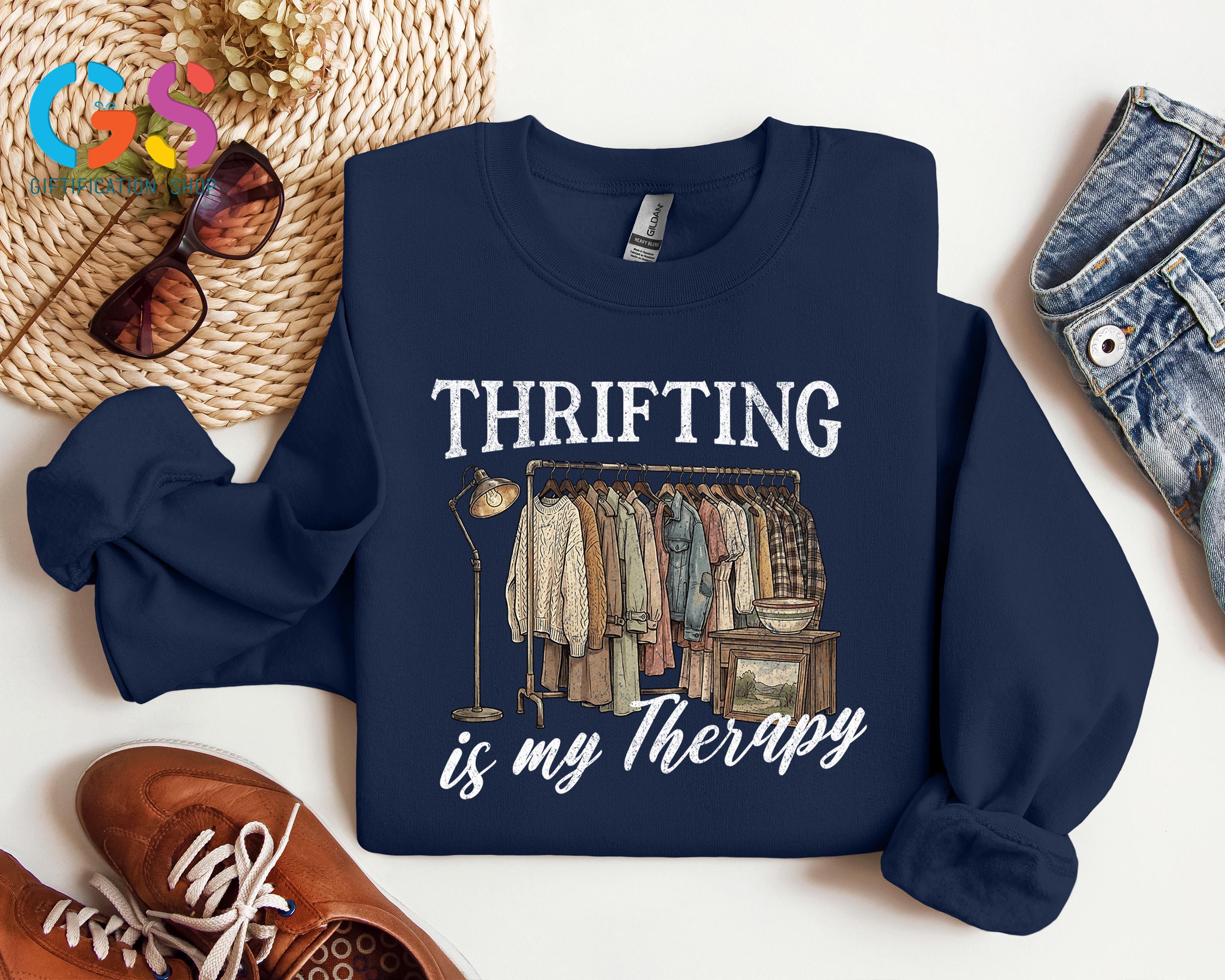 Thrifting Is My Therapy Sweatshirt is the perfect cozy statement piece for anyone who lives for the thrill of thrifting, junkin, and uncovering vintage treasures at garage sales, estate sales, and antique shops. Designed for the thrifting queen and conscious consumer, this funny thrifted shirt celebrates second-hand style, sustainable fashion, and the joy of mystery finds, making it an ideal gift for her or any antique lover. Whether you’d rather be thrifting than shopping new, love one-of-a-kind vintage t-shirts, or proudly embrace eco-friendly clothing, this second-hand queen sweater pairs effortlessly with casual outfits and sparks conversations wherever you go, making it a thoughtful sale gift for birthdays, holidays, or everyday wear.