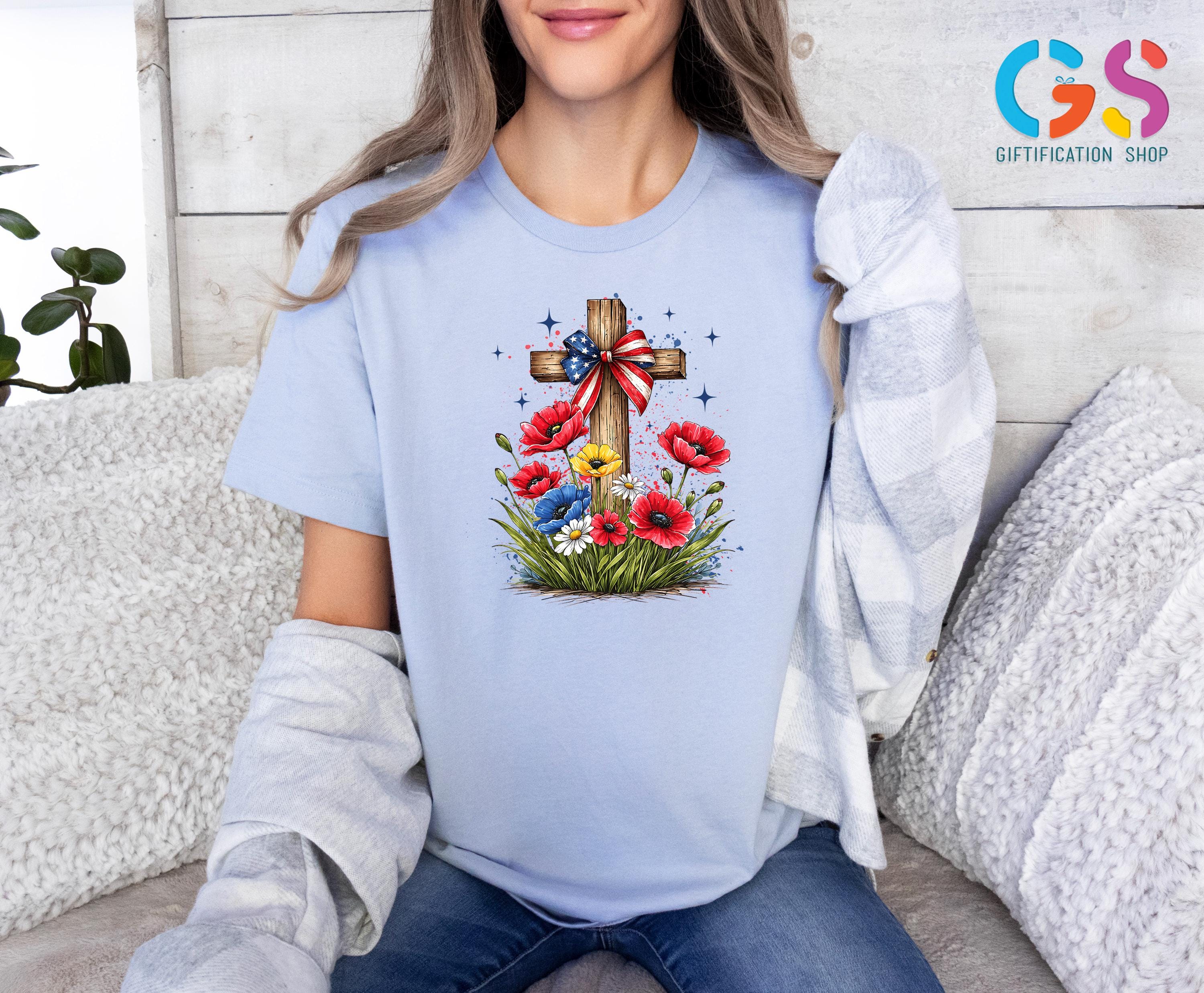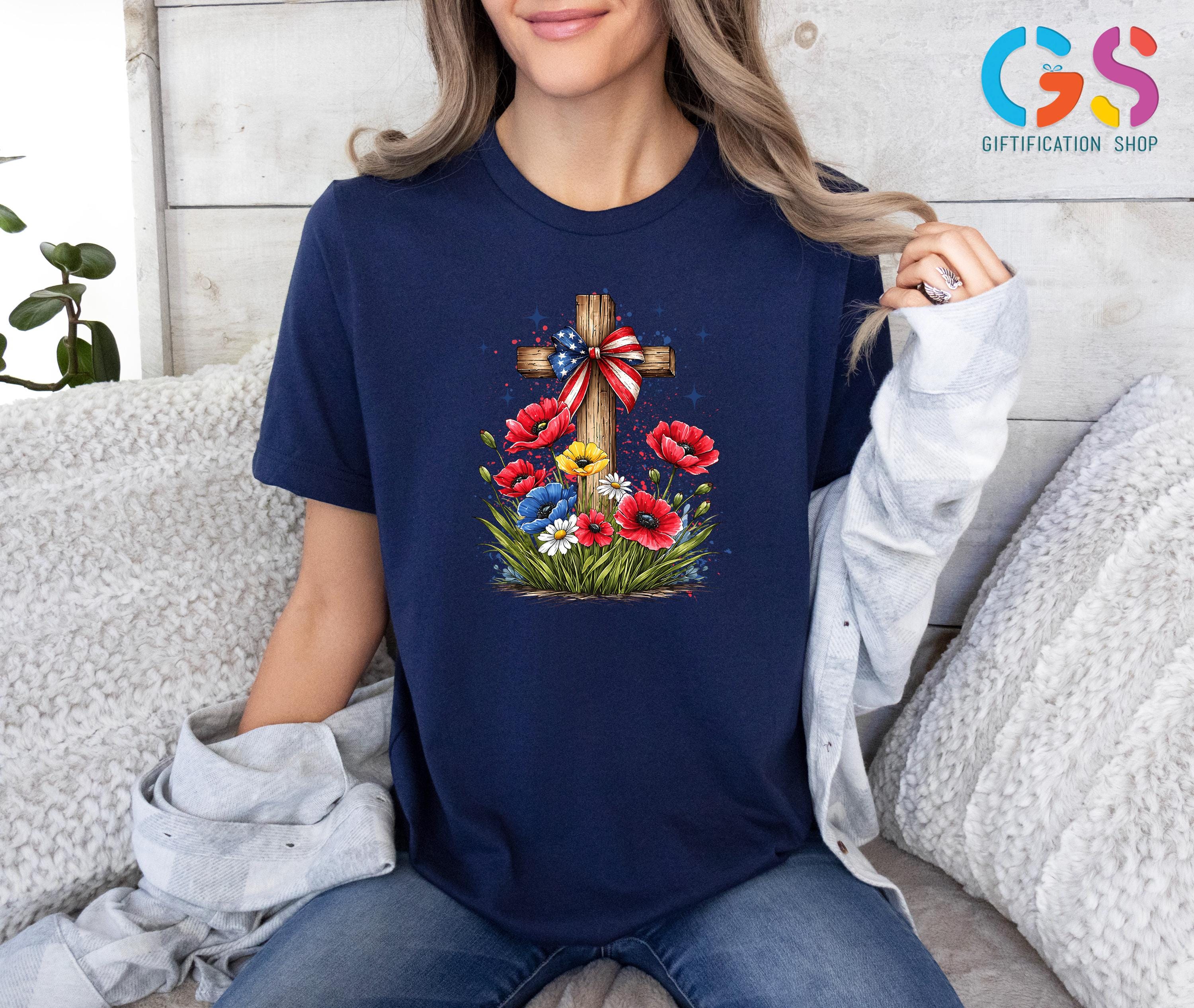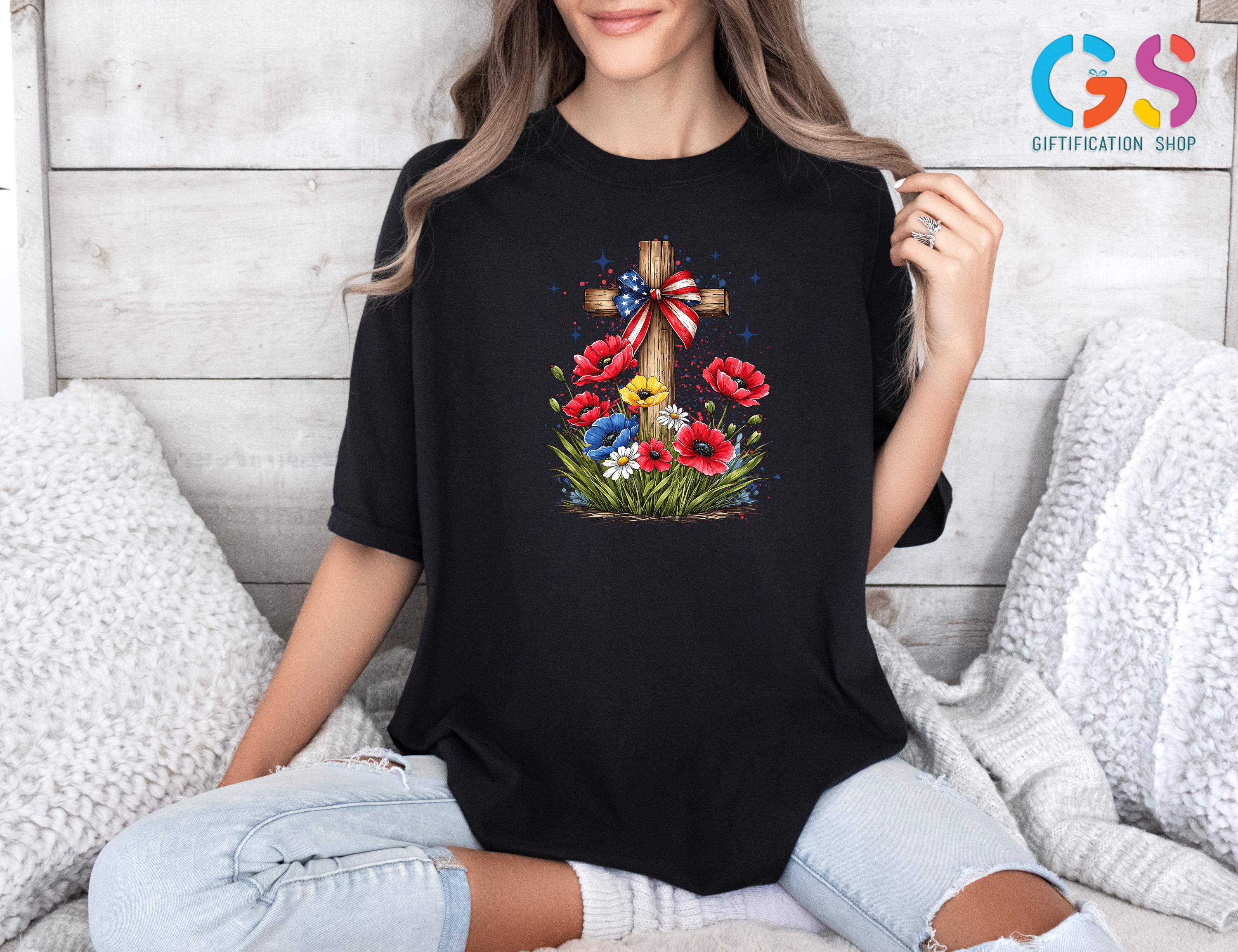 Floral Christian Cross Shirt, Patriotic Wildflower Tee, Religious Gift For Her, 4th Of July Apparel