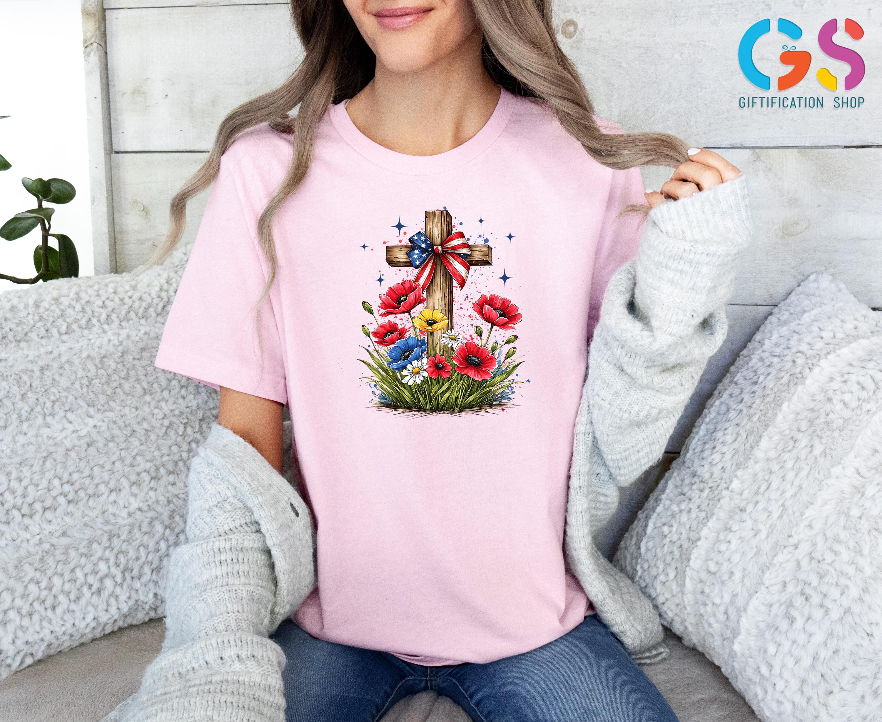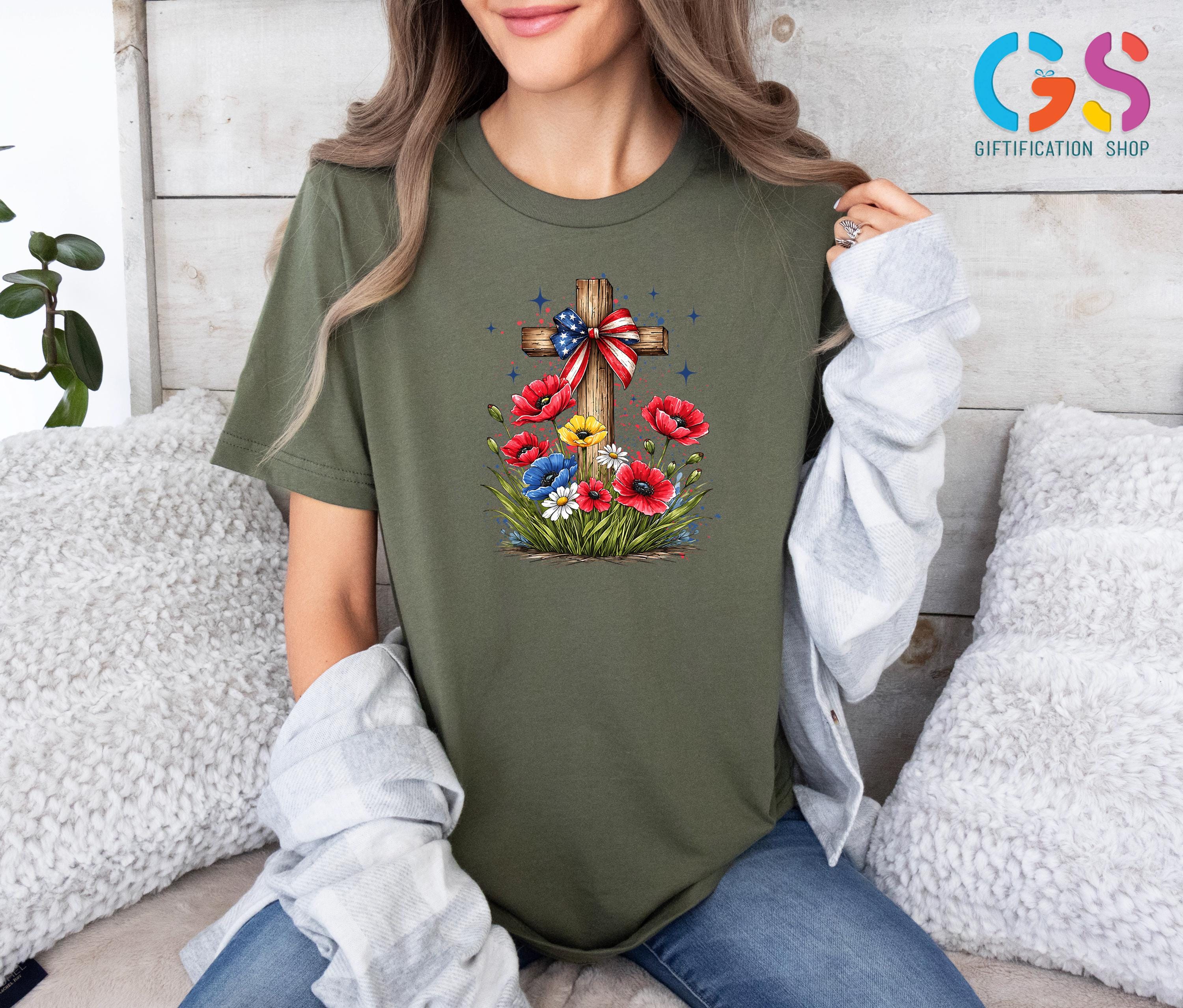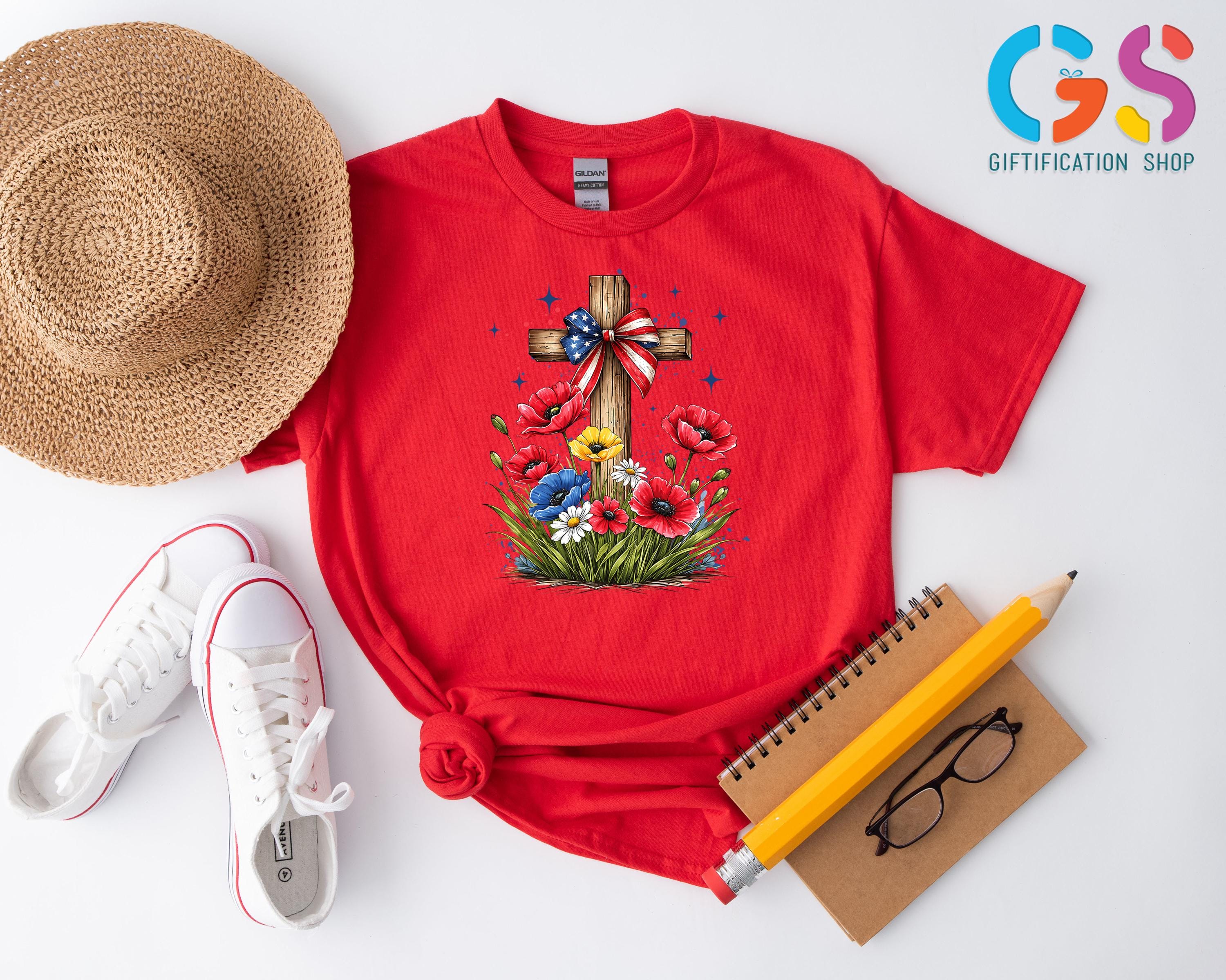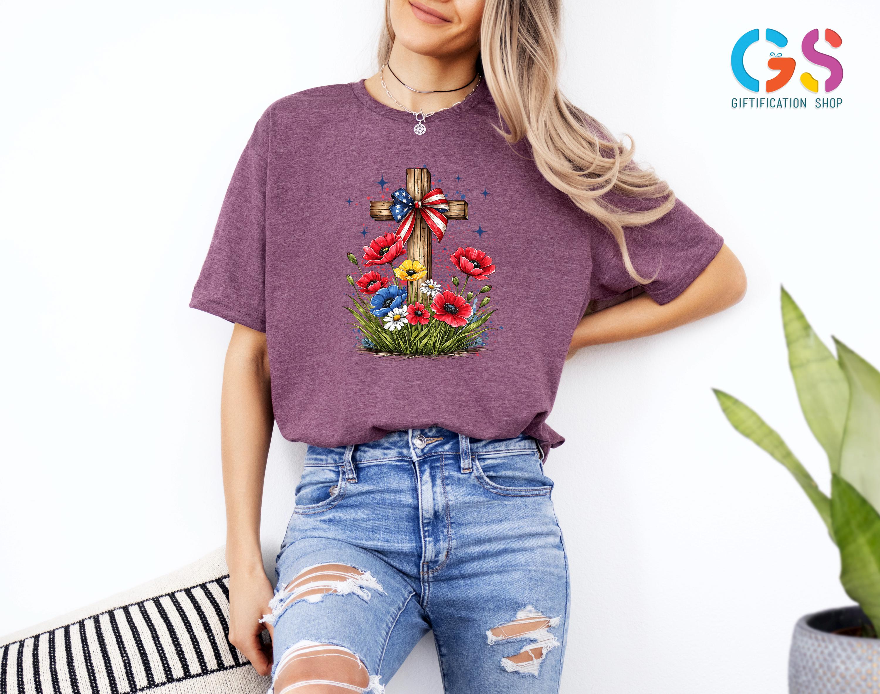 Floral Christian Cross Shirt, Patriotic Wildflower Tee, Religious Gift For Her, 4th Of July Apparel